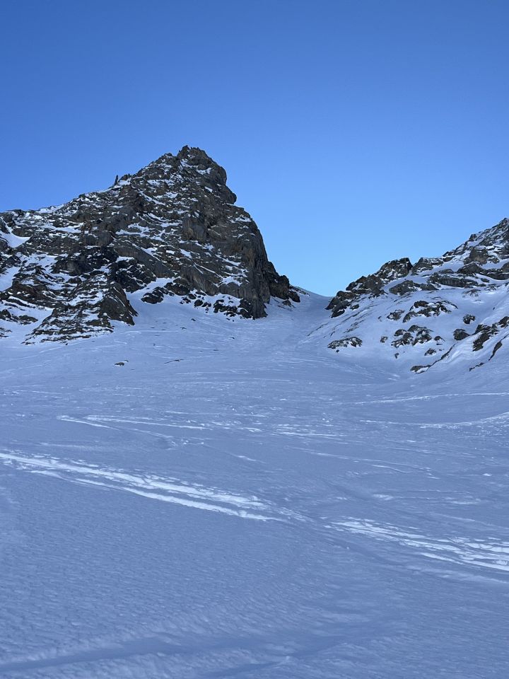 Schneequalität sehr inhomogen von hartem Bruchharsch bis Pulver alles vorhanden, ohne Harscheisen wäre es ein Kampf geworden, mit ging es ganz gut. Im Aufstieg gut sichtbar: Die zwei Couloirs die im SAC Tourenportal beschrieben sind wurden beide mehrfach befahren, hier liegt ca. 10cm aufgebauter Pulver.