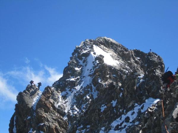 Bei keinen grösseren Niederschlägen insbes. Neuschnee wird der Biancograt nicht weniger heikel; im Zweifelsfall diese Stellen mit Eisschrauben sichern.
