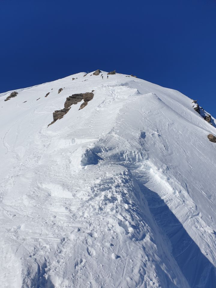 Beim pp können ski angeschnallt werden. Es hat noch viel schnee. Spur biregrabe sehr gut angelegt und bequem zu laufen, da der schnee noch pulverig weich war. Spur geht im moment bis ca 10m unter den grat. Zustieg grat und über den grat problemlos zu fuss dank guten trittspuren. Zuletz auf den gipfel wieder mit ski in guter spur.