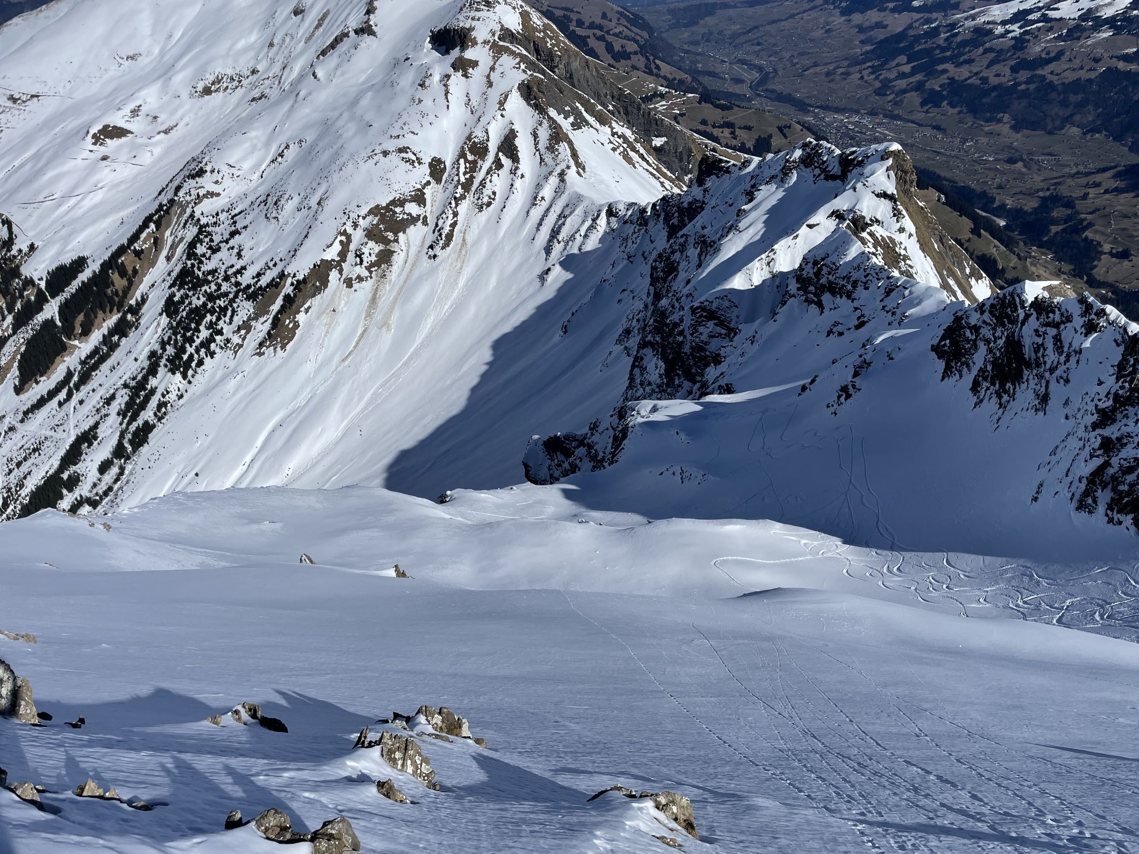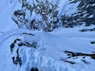 Start ab Chirelsagi, ab da schneebedeckte Strasse mit 3 aperen Stellen. Ab Schiessplatz Aufstieg auf wenig Triebschnee auf gefrorenem Grund. N-Couloir ähnlich, erschwerte Spurarbeit. Steigeisen ab mittlerem Drittel. Ausstieg aus Couloirtraverse mit griesig zt lockerem Schnee und tiefer Spur. Einmündung in bestehende Ski-Aufstiegsspur vom Ostcouloir. Mit Skis bis Gipfel. Abfahrt am Gipfelhang im Butterpulver, Abfahrt Ostcouloir brüchig/schollig, kein Eis. Ab da Sulz 1a.