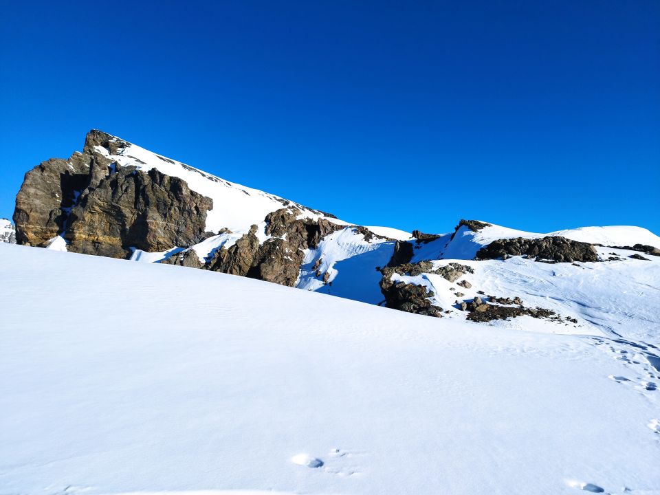 Ich würde die Abfahrt erst am Nachmittag machen, weil der Couloir steil ist und der Schnee war meisten sehr hart. Wir sind weiter zum Krönten und Wintertürmli gegangen.