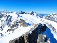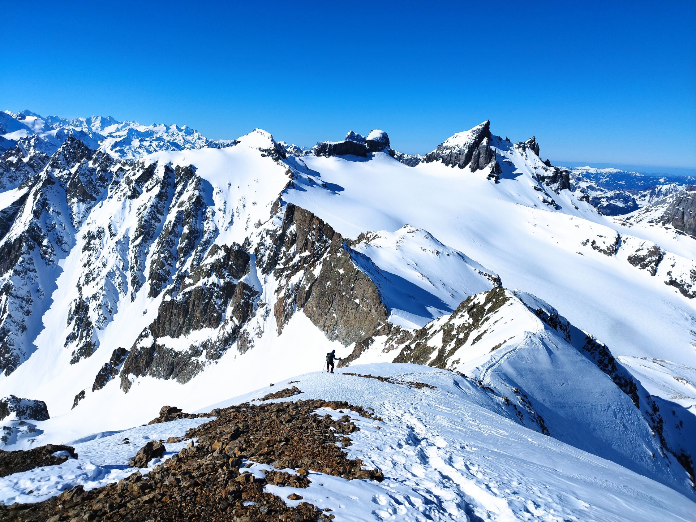 Wir sind Färnigen über Zwächten zum Krönten gekommen. Schnee auf dem Gletscher war ein wenig Windgepresst, aber noch gut zum Fahren. Wir mussten den Skidepot auf ca. 2900m, da der Hang abgeblasen wir. Fussaufstieg ging recht gut. Der Grat hat sehr wenig Schnee.