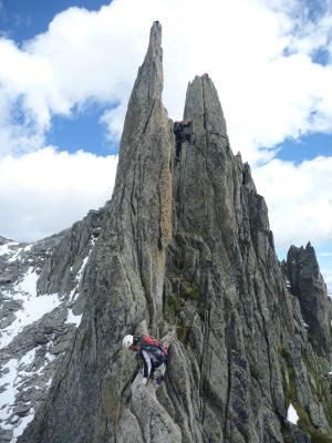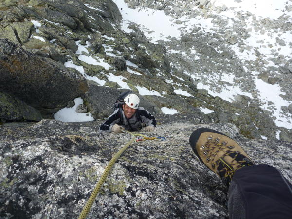 Wir haben den gesamten Schildkrötengrat (inkl. Sphinx) gemacht. Der Grat war vollständig schneefrei. Der Zustieg ab der Sidelenenhütte und der Abstieg ab Kamel waren heute aber noch mit lockerem Schnee bedeckt der die Löcher im Geröllfeld unangenehm verdeckte. Es waren aber einige Kletterer unterwegs und ein Trampelpfad ist entstanden, so dass mittlerweile alle Löcher "gefunden" sein sollten. Beim Einstieg am Morgen war der Fels so kalt, dass nach dem dritten Griff die Finger schon gefühllos waren. Kletterhandschuhe sind empfohlen.