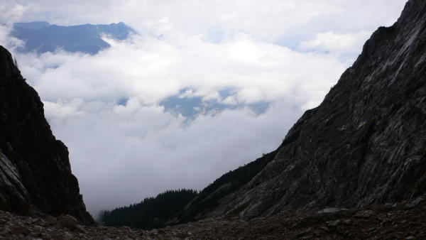 Landschaftlich großartige Tour in absoluter Einsamkeit, großartig die Blicke auf die Felsabstürze Zwölfer-Kopf und hinüber zum Großen Waxenstein. Eindrücklich der Tiefblick ins Höllental.