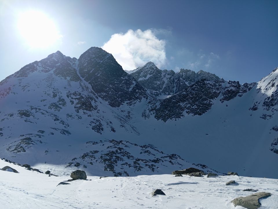 Wechselnde Schneeverhältnisse, neue Spur am Gipfelaufstieg gelegt, windig und kalt