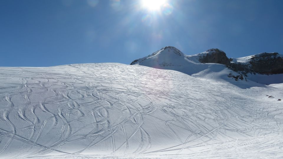 Es liegt noch genügend Schnee. Unten im Schatten etwas hart, im oberen Bereich Sulz, aber sehr gut zu fahren.