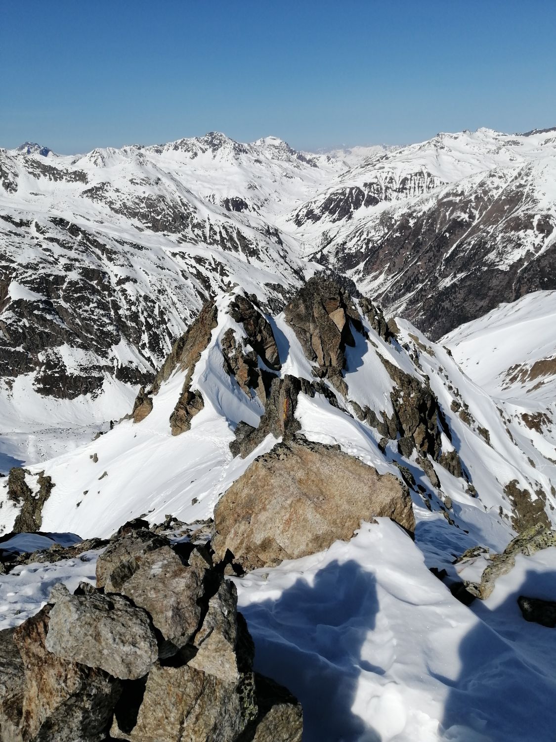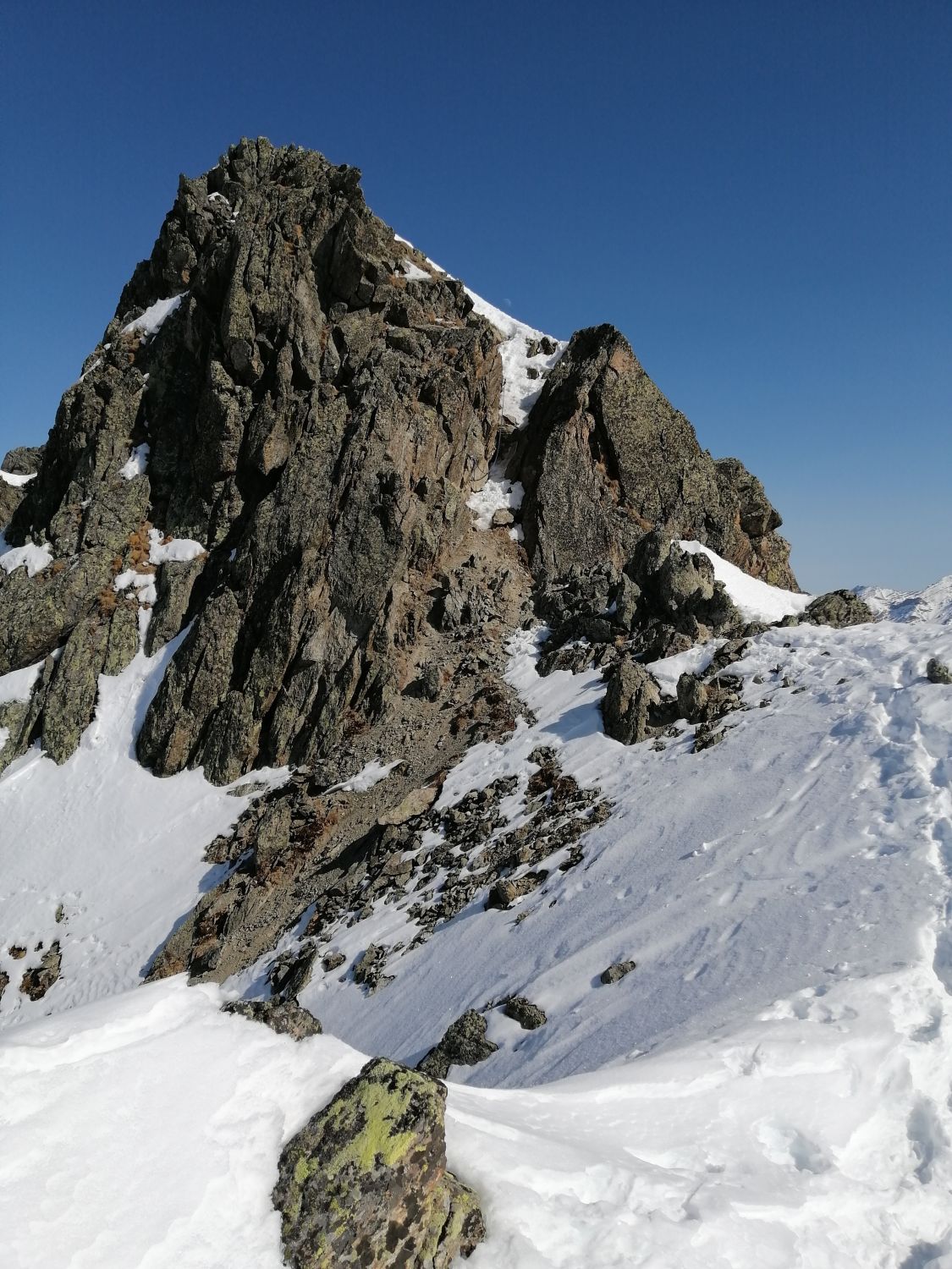 Der Gipfelgrat ist gut zu gehen, keine Wächten. Im Kamin vor dem Gipfel hat es Eis - Steigeisen sind hier angenehm.
