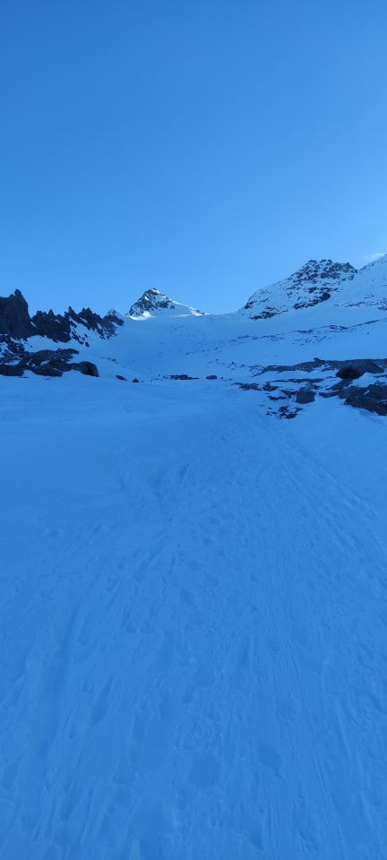 Auf dem Gletscher haben wir für die 100 Hm Abfahrt die Felle anbelassen (in beide Richtungen). Es gibt aber auch einige, die abfellen. Die Gletschertraverse ist zügig gemacht.
