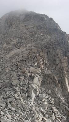 Abstieg über den N-Grat, welcher zuerst einfach (Blockgelände), dann aber vor dem Gendarmen sich ziemlich "scharf" zeigt. 3 SL waagrecht entlang der Gratkante (ca. 3a), ausgesetzt. Der Gendarme kann auf der Forno-Seite umgangen werden (ein Steinmännli). Danach weitgehend Blockgelände im zweiten Schwierigkeitsgrad bis zur Furcela dal Riciöl.