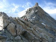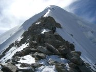 Beste Bedingungen. Kein Schnee auf dem Grat. Firnschneide mit einigen, wenigen blanken Stellen, aber unproblematisch. schöne kletterei am kompakten Fels.