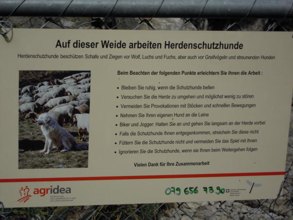 Beim Abstieg via Färnital wurden wir von den Herdenhunden nicht sehr freundlich begrüsst! Nichts ahnend folgen wir der Markierung welche uns an einer Schafherde vorbei führt. Auf der Verhaltenstafel - die aber erst später am Wegrand befestigt ist - bekommen wir bestätigt, dass wir uns den bellenden Hunden gegenüber anscheinend richtig verhalten haben.