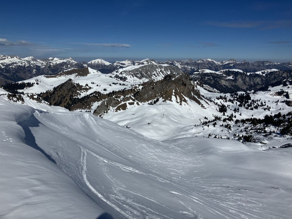 Strasse ab Parkplatz zum Brätliplatz nicht mehr durchgehend mit Schnee, man konnte sich in der Abfahrt aber heute noch den Hang oberhalb P.1413 und unten dann rechts von der Strasse durchmogeln. Ab Alphütten Seeberg im coupierten Gelände Richtung Stiereberg liegt schattseitig noch alter Pulver. Wir sind vom Stiereberg in den Gubi-Pass und den ganzen Rücken hoch zum Skigipfel Fromattgrat. Abfahrt dann direkt durch einen Wechtendurchschlupf in den Nordhang - und noch Pulver gefahren. Danach natürlich Sulz.