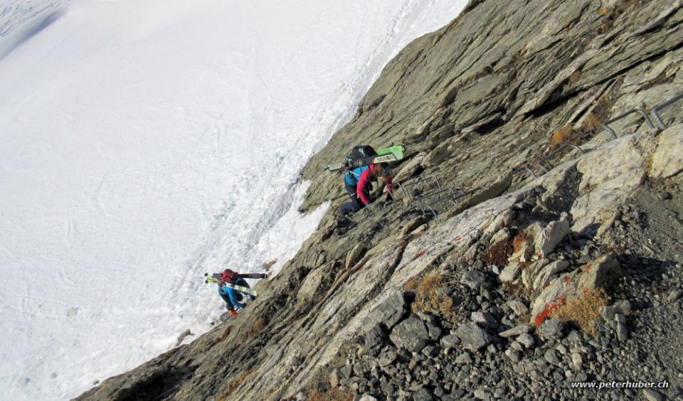 Mit der Tourengondel (nach Voranmeldung am Vortag) um 7 Uhr hochgefahren. Auf den Liften morgens eisig kalt. Querung zur Kletterstelle hart gefroren. Kletterstelle problemlos zu machen, schneefrei. Anschliessend fehlt Schnee sodass die Skis besser noch zirka 200 m aufgebunden getragen werden bevor man in der Mulde auf den Gletscher abfährt.