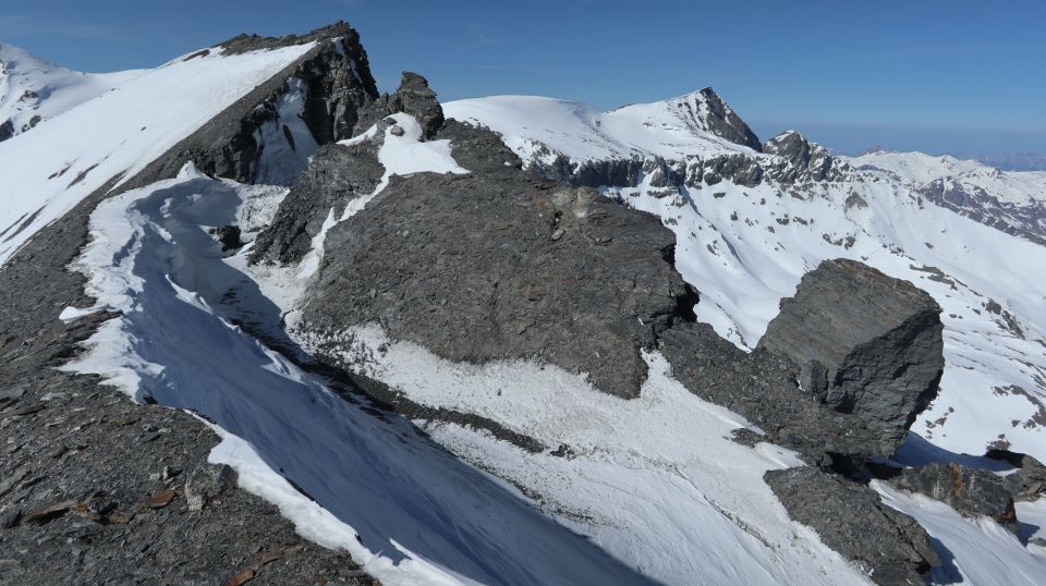 Nordwestrücken hat sehr wenig Schnee, Grat ab P.2997 schneefrei und zu Fuss gemacht. Abfahrtsgenuss bei den Schneeverhältnissen kaum vorhanden. Stelle den Bericht hier hauptsächlich rein, um darauf aufmerksam zu machen, dass vermutlich bald wieder ein Felsabbruch bevorsteht. Nach P.2997 gibt es frisch aussehenden einen Graben, der sich in Falllinie nach Süden runterzieht und etwas weiter östlich davon einen Graben nordseitig am Grat, wo sich etwas abzuspalten scheint (siehe Bild). Besser viel Abstand halten.