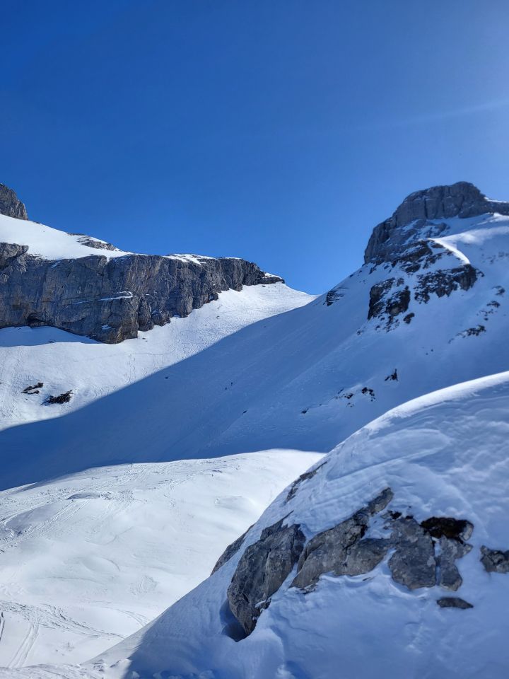 Der Schnee war im gesamten Aufstieg hart und vom Wind geprägt. Harscheisen blieben die meiste Zeit an den Skis. Die steile Querung unter dem Chli Chaiser hart und mit Vorsicht (Harscheisen) zu begehen.