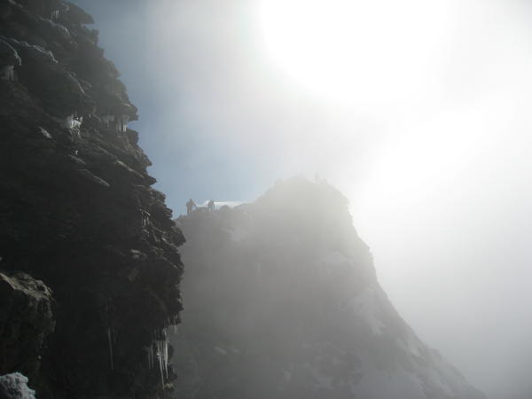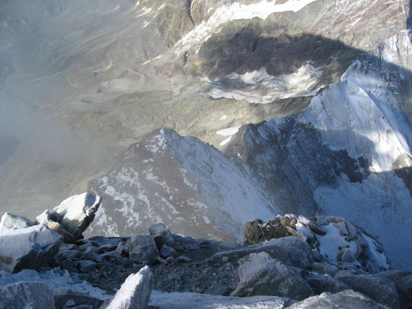 Super Verhältnisse und in dieser Jahreszeit eher wenige "Verkehr" am Horu. Am Liongrat bis ca 4000m schneefrei, danach vermehrt Eis und Schnee. Hörnligrat bis Schulter im Schnee und Eis, danach ohne Steigeisen bis Hörnlihütte.