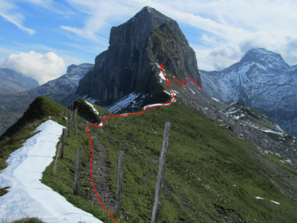 Mit dem Schnee muss man noch rechnen. Die steilen Grashänge sind nass, das Gras glitschig. Die schiefrig-lehmigen Flanken sind ebenfalls glitschig. In Nordhängen und Couloirs über 2000m liegt zum Teil recht viel Schnee.