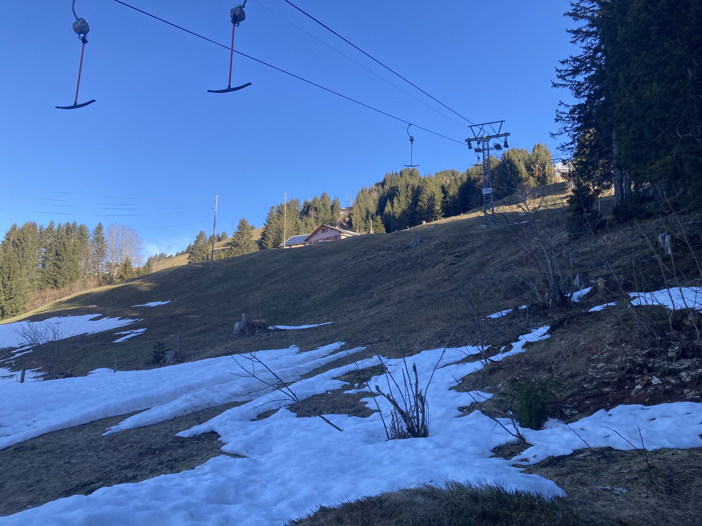 Start ab der Bergstation der Seilbahn zuerst mangels Schnee zu Fuss und dem signalisierten aperen Winterwanderweg folgend. Der Schlepplift / das Miniskigebiet ist mangels durchgehender Schneedecke aktuell zu.