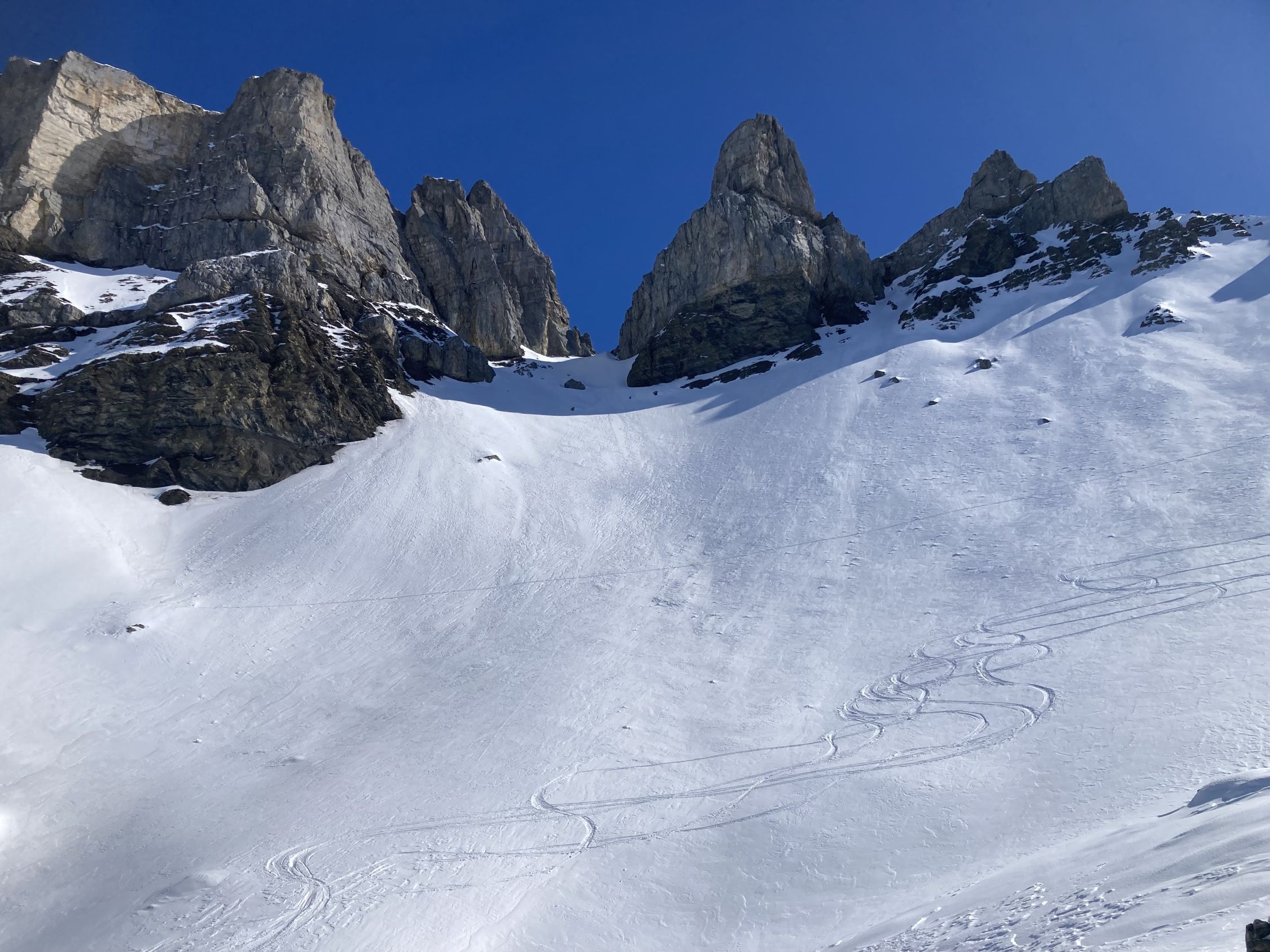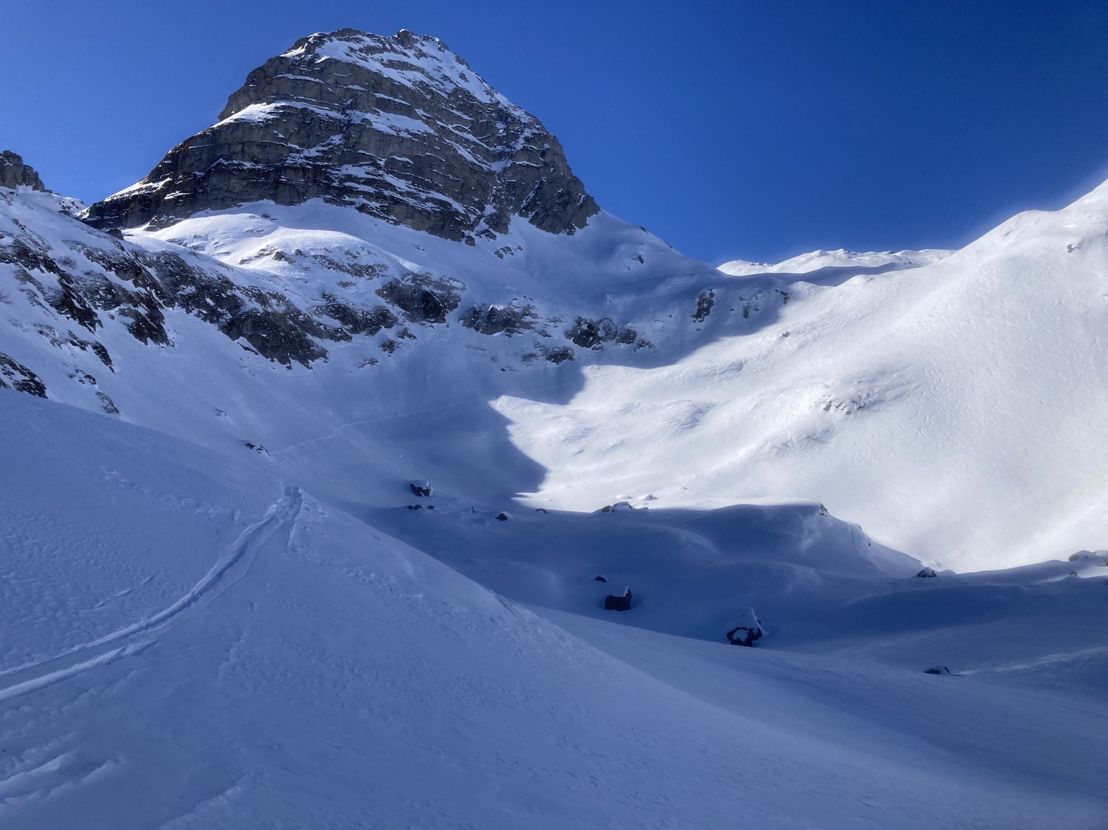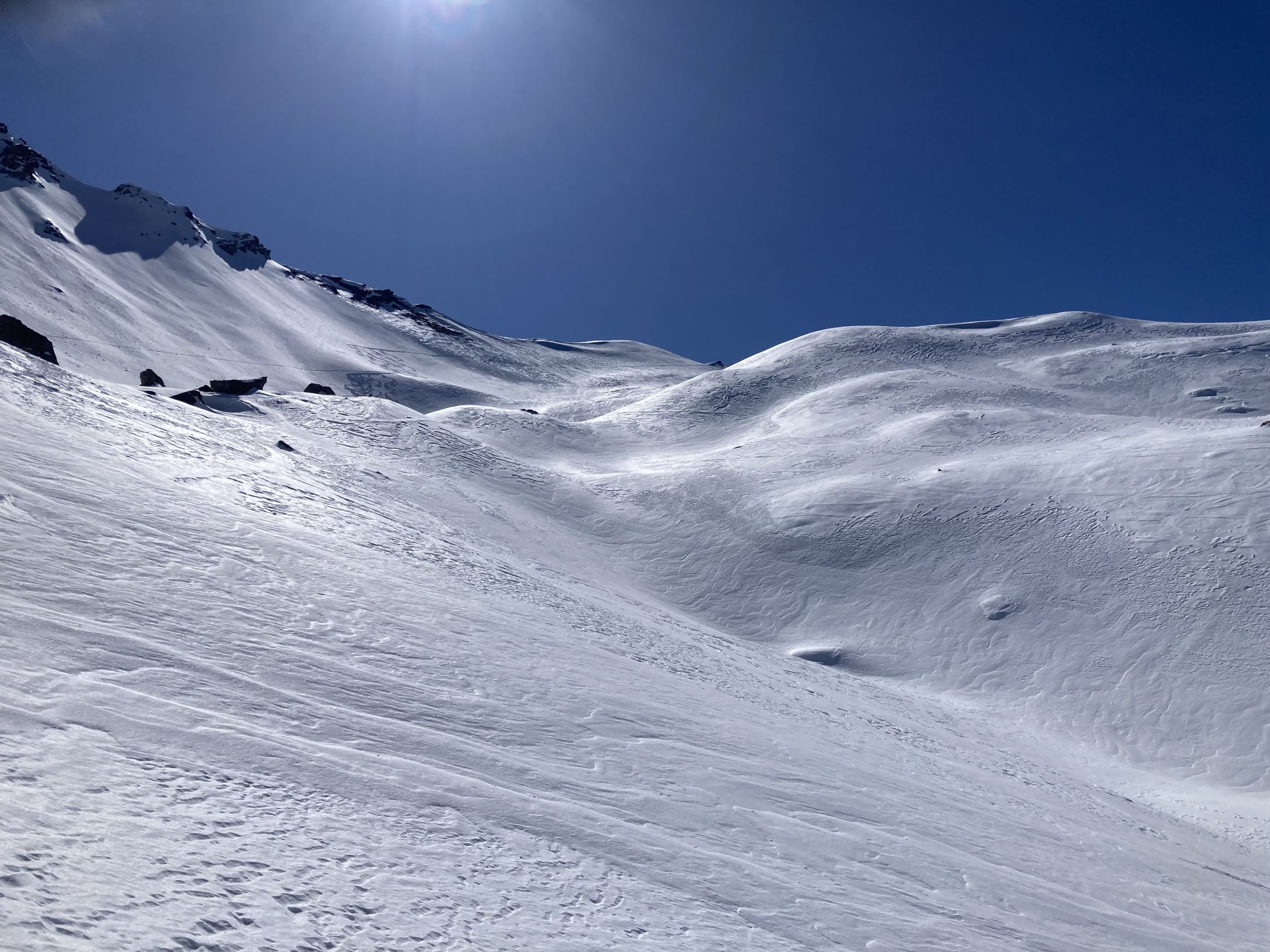 Abfahrt auf den ersten 200 Höhenmetern die Pulverschattenhänge ausnutzen anschliessend Supersulzige Verhältnisse in den Grundplanggen,