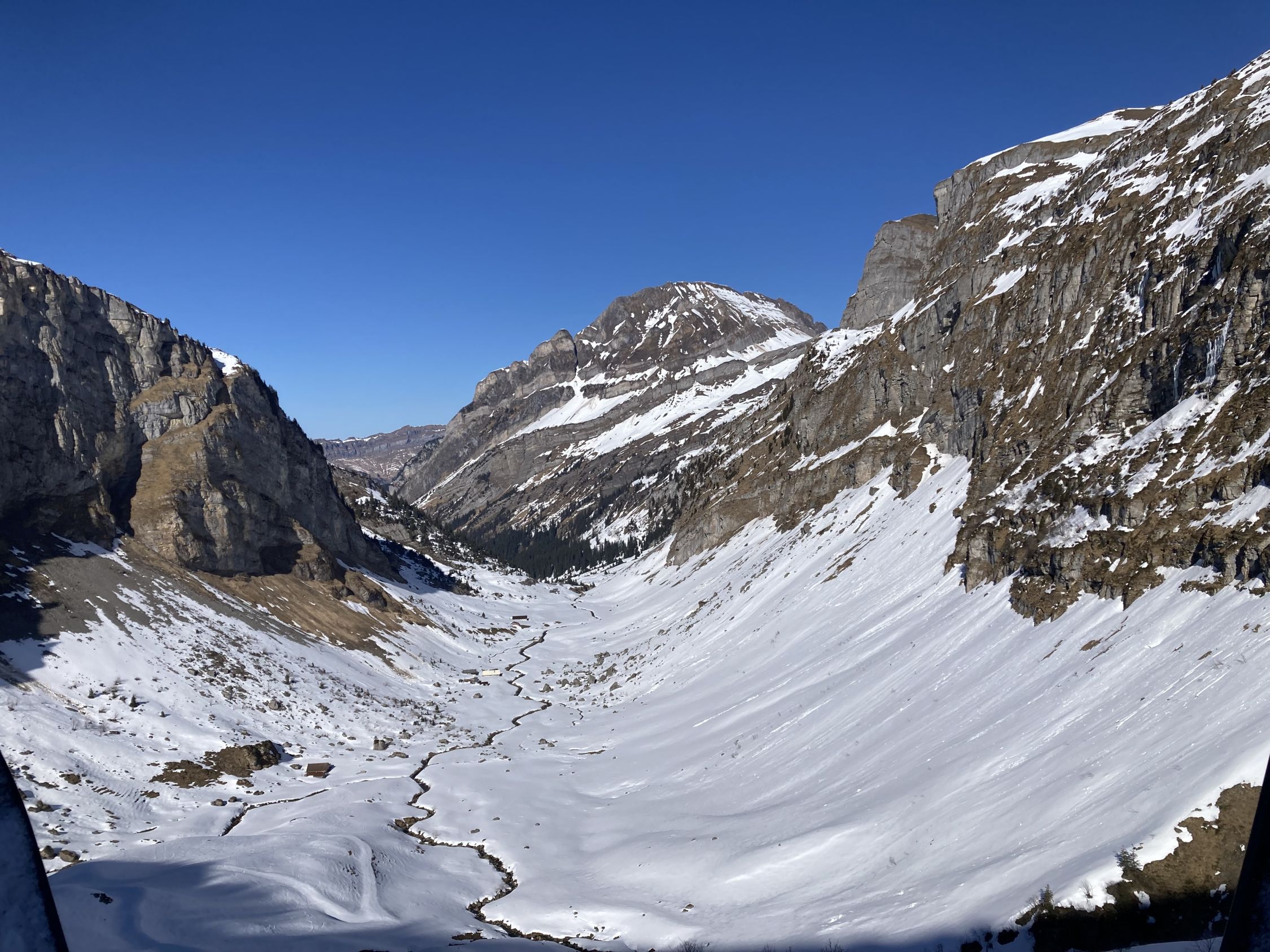 Abfahrt nach Grundplanggen: Pulverschnee nur noch in Schattenhängen, ansonsten eisige Oberfläche.