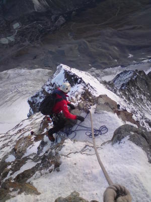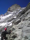 Gute Verhältnisse mit trockenem Fels. Ab Schulter Stellen mit Blankeis. Wir waren froh um unsere Pickel!