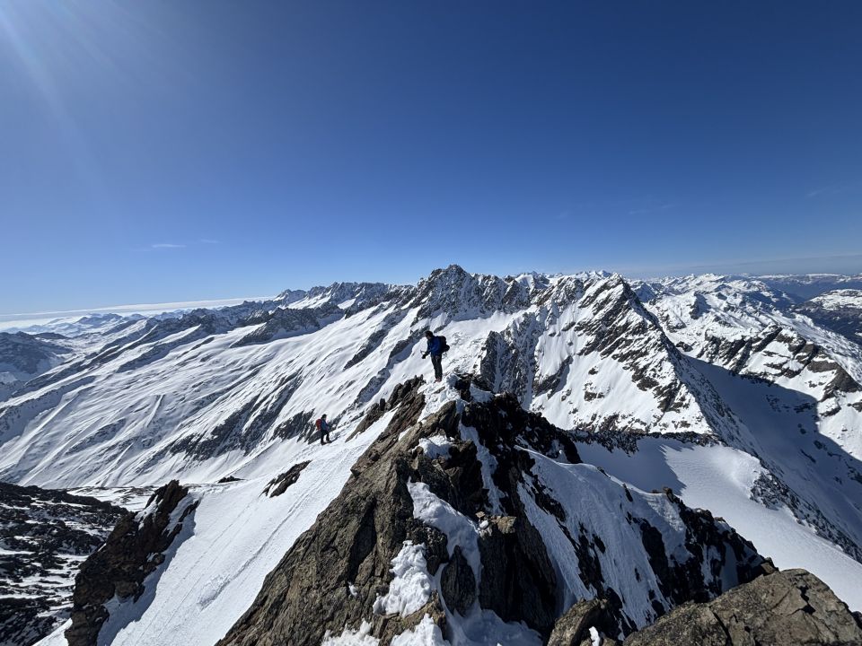 Geschlossene Schneedecke ab Brücke, ging alles ohne Harscheisen, Couloir vom Skidepot bis zum Grat guter Trittschnee, Fussaufstieg zum Gipfel mix zwischen Trittschnee und trockenem Fels, Schlüsselstellen gut zu gehen; in der Abfahrt im oberen Teil noch Pulverschnee, danach alle Arten von Schnee, im untersten Teil erwartungsgemäss hart und ruppig; schöne Skihochtour mit weniger Begehungen als andere Ziele in der Region, tolle Bäsenbeiz in Meien!