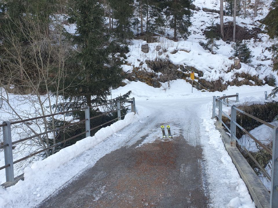 Ab Guarda Brücke (P1361) eine durchgehende Schneedecke auf dem Alpweg; zuerst etwas eisigig, später auf Hartschnee besserwerdend zur kleinen Brücke bei Craista d'Nuna (P1567). Zu diesem Punkt auch Spuren von Ardez hochkommend.