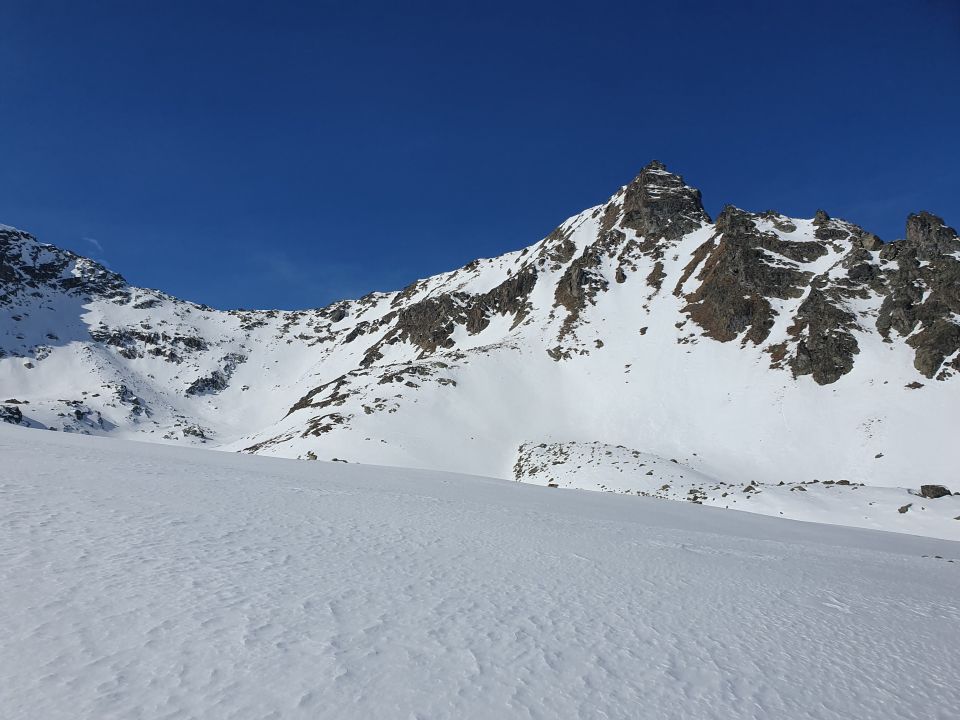Die Skitourentoute zum Piz Sursass wies eine gute und frische-, und die zum Piz Nuna und/oder Piz Macun eine zuerst eingewindete und dementsprechend eine rutschige Spur, und bald schon dann, wie vermutet, gar keine erkennbare Spur vorhanden. Somit selber sehr steil hoch zum Stavel da Chamuotschs gespurt. Hier sehr lockerer Pulverschnee, stark einsinkend. Nach dem Ausstieg kommt als willkommene Erholung eine gemütliche Ebene nach W. Nun hat man eine gute einsicht zum Couloir, der ca. 150Hm in 40° Steilheit verlangt. Diesen durchgängig sehr angenehm mit Skis hochgespurt, was aufgrund des gut griffigem- und nicht ganz aufgesulztem Schnees sehr gut ging. Nach dem Ausstieg erreicht man in ein paar Minuten den Piz Macun.