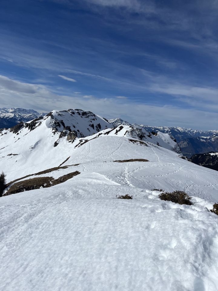 Start etwas nach 8 Uhr bei Pkt.1470 ( Waldeggallmi). Auf Schneeresten der Strasse entlang mit kurzen aperen Stellen zur Bergstation des Howald Skilift. Ab dort gibt es noch genügend Schnee. Kurz vor der Alp Oberberg links hoch auf den Grat Ptk.2028. Schöne kurze Sulzschnee Abfahrt nach Alp Oberberg. Von dort auf der Normalroute zum Gipfel. Schlüsselstelle kurz vor der Gipfelflanke schneefrei und ein paar Schritte Skier getragen.