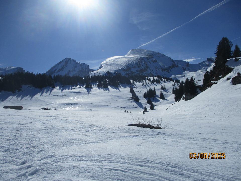 Bis Höhe 1280 m (Ziehweg) wechselten sich Schneefelder mit längeren aperen Passagen. Danach kontinuierlich Schnee. Der Gipfelrücken, wie gewohnt, stellenweise bis aufs Gras abgeblasen. Harte, griffige Schneedecke - bestens geeignet für den Aufstieg mit Schneeschuhen. Ohne Durchrutschen, aber auch ohne Pulvererlebnis, im Abstieg.