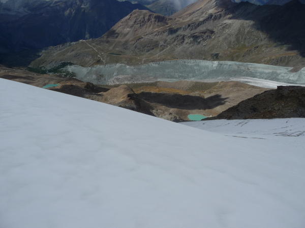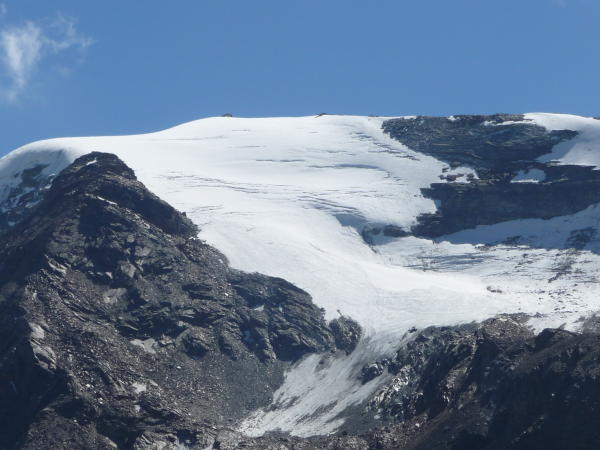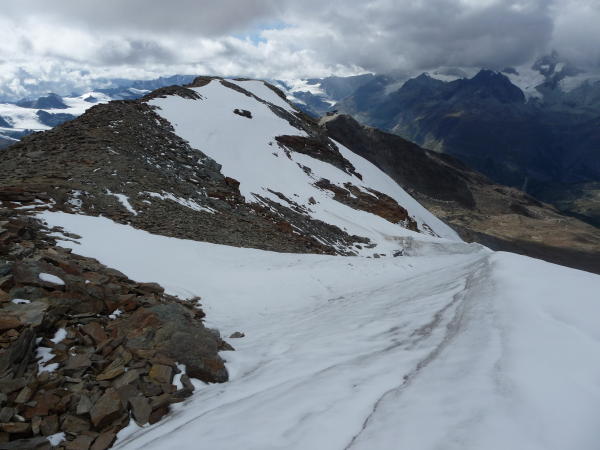 Nordlappen Triftjigletscher durch Rückgang nun sehr steil und heikel (Schraubensicherung, Steinschlag). Umgehung über Felsen links, diese sind aber sehr lose. Nordwestflanke unten aper, oben Restschnee. Spalten nur teilweise offen. Durch die Kälte Schneebrücken stabil, aber lieber am linken Rand umgehen. Grat zum Hohtälli sehr ausgeapert und teilweise Blockkletterei.
