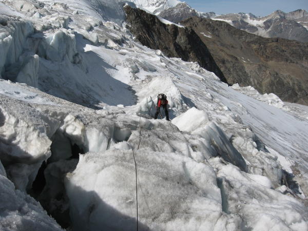 was am Grad aper ist. Riedgletscher war genau am Gletscherbruch aper. Ca 50-100m Abstand zu den Begrenzungsfelsen halt umd Durchschlupf zu finden. Haben kurz mit Eisschrauben gesichert, da ein Brücke aus Eis-Klemmblöcken bestand die ziemlich hohl klangen ...