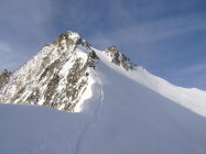 Wenig Schnee auf dem Hohbalmgletscher und der hat auch Spalten, zum Windjoch hinauf teilweise aper. Auf dem Grat guter Trittschnee, wenige Stellen blank. Im unteren Teil die Felsen überschritten, die obersten N umgangen. Gipfel direkt über felsen erklettert.
