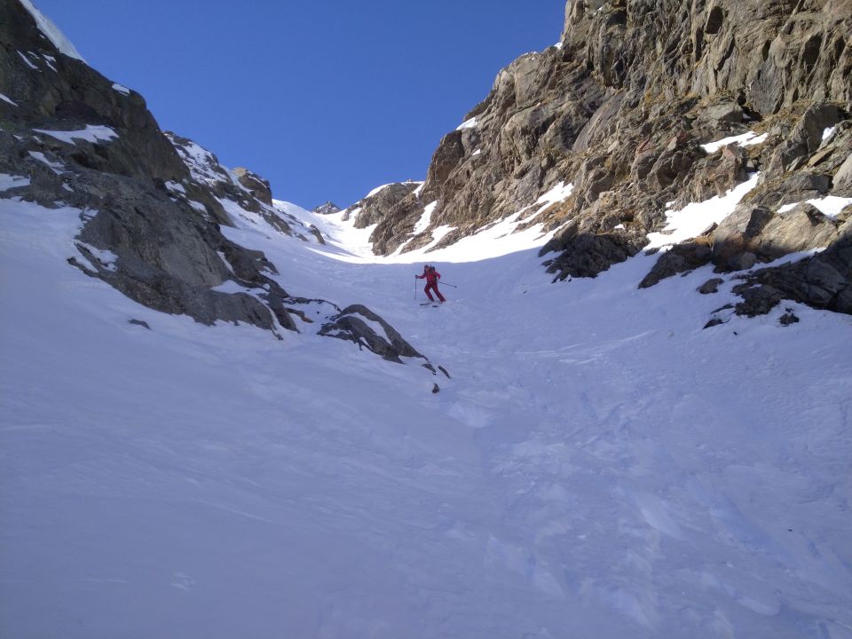 Der Wind und die Temperaturen haben gearbeitet. Aus schönstem Pulver wurde innerhalb ein paar Tagen Pressschnee. Egal, wir hatten das Ziel das wir verfolgten erreicht. Eine spezielle Rinne, die bei dieser konstanten Lawinensituation möglich ist, konnten wir fahren.