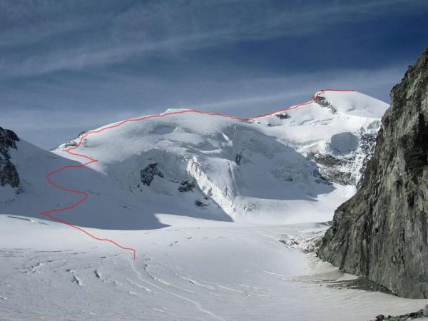 Sehr guter pulveriger Trittschnee. Die Spalten sind gut sichtbar und können gut überquert oder umgangen werden. Die Kletterpassage im Fels hat Schnee drin, die Felsen sind trocken.