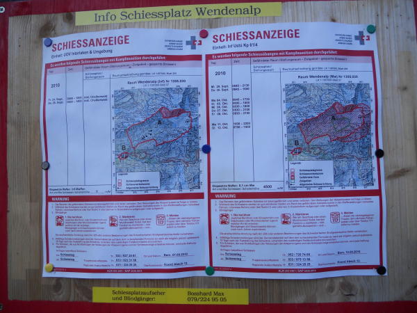 Achtung: auf der Wendenalp wird ab Ende dieser Woche scharf geschossen. Sofern ich die Schiessanzeige korrekt interpretiere, so besteht am 24./25./29./30.9., sowie vom 4.-8.10. und am 11./12.10. kein Zugang zum Gebiet (siehe Foto unten, hochauflösende Version mit allen Details versende ich gerne auf Anfrage per E-Mail).