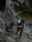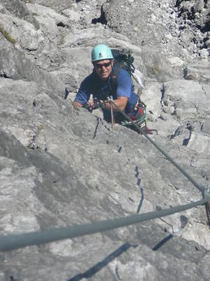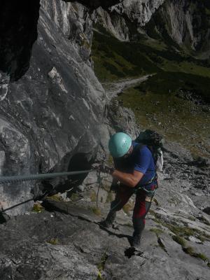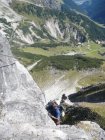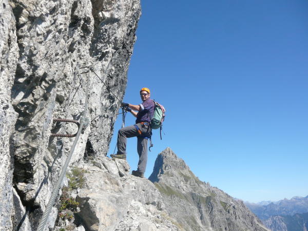 genussvoller Steig, der sehr gut einer logischen Linie durch die Wand und an der Kante folgt. Tolle Kletterei mit schönen Tief- und Ausblicken