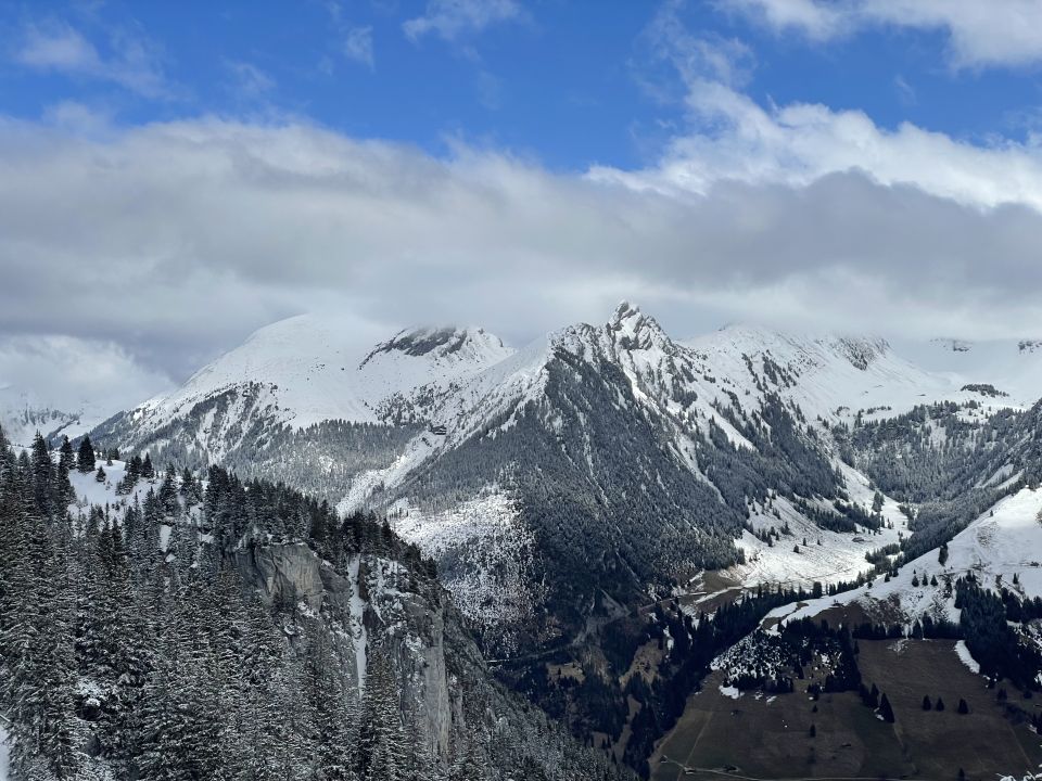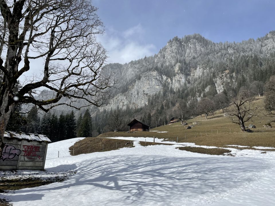 Im Meniggrund beim Start um die Mittagszeit nur 2 Tourengängerinnen, tiefer Friede. Wetter bewölkt mit teils Sonne, kein Niederschlag. Ab Brätliplatz 5-10 cm Neuschnee auf nasser Unterlage, nichts gefroren. Die Alpstrasse unterhalb ist via Abkürzung mit 1mal Skiausziehen machbar, auf der Alpstrasse längere Tragestrecken. Ich kam heute auf dieser ja nicht langen Tour ordentlich ins Schwitzen, zum (teils tiefen) Spuren hinzu (ich war erster heut) kamen grosse Stollen an den Ski, die vier Reinigungshalte verursachten. Meine Hoffnungen bezüglich Abfahrt hatte ich schon im Aufstieg teils begraben, zu sumpfig war das alles. Die obersten 50 Meter waren dann aber doch schön, dann jedoch gedeckelt und unregelmässig, auch für gute Skifahrer eher Arbeit als Genuss, für mich erst recht. Je weiter unten desto einfacher allerdings, man kann sich auf dem Sommerweg noch bis zum PP durchmogeln.