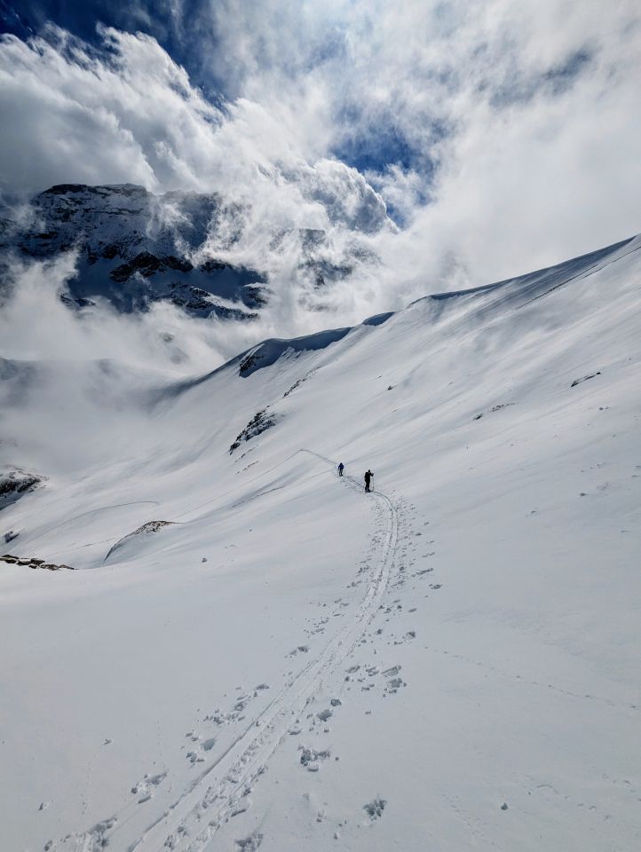Ca. 20 cm Neuschnee auf Harschdeckel. Ließ sich gut abfahren. Südost Abfahrt war sehr steinig. Abfahren über Aufstiegsroute.