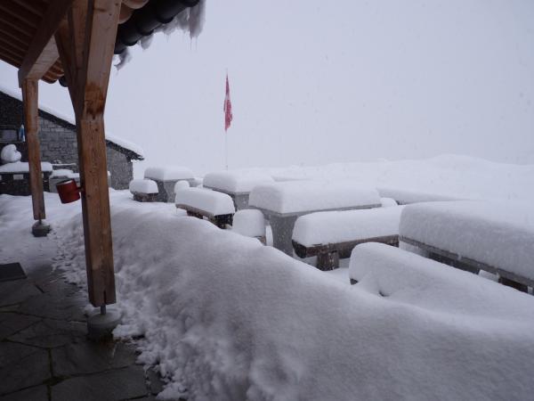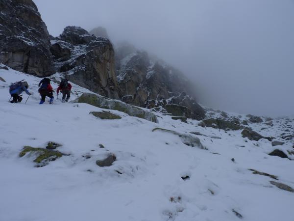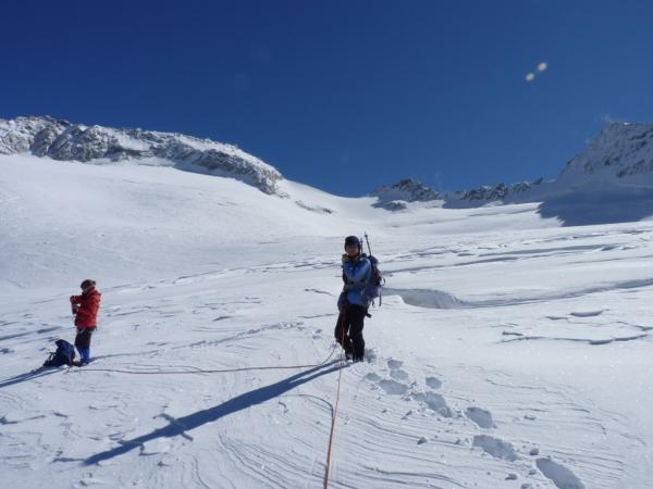 Bis unter die Südwand der Punta da l'Albinga ca 10-15 cm Schnee, danach immer etwas mehr Schnee. Auf dem Gletscher lagen am Sonntag ca. 30cm Neuschnee. Der Auf- und Abstieg durch das verschneite Geröll war sehr zeitaufwändig, daher auf 3000m umgedreht.