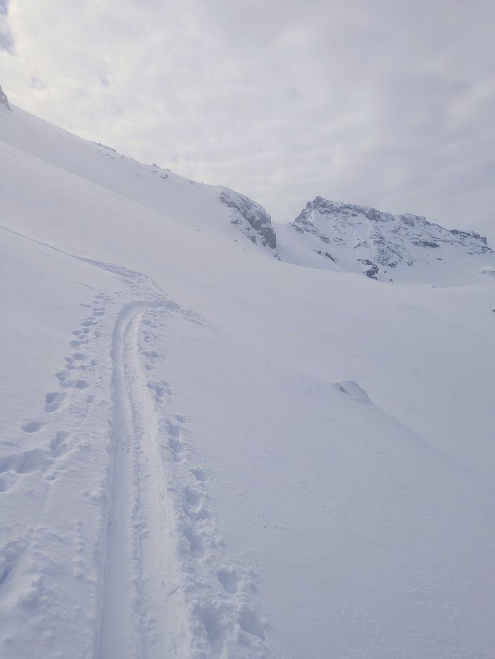ca. 30 cm Neuschnee auf Harsch. Etwas Triebschnee im oberen Bereich. Sonst gute Verhältnisse. Im oberen Bereich können Harscheisen hilfreich sein. Skidepot etwas weiter unten anlegen, da Aufstieg zum typischen Skidepot steinig ist. Gipfelaufstieg zu Fuß ohne Probleme machbar.