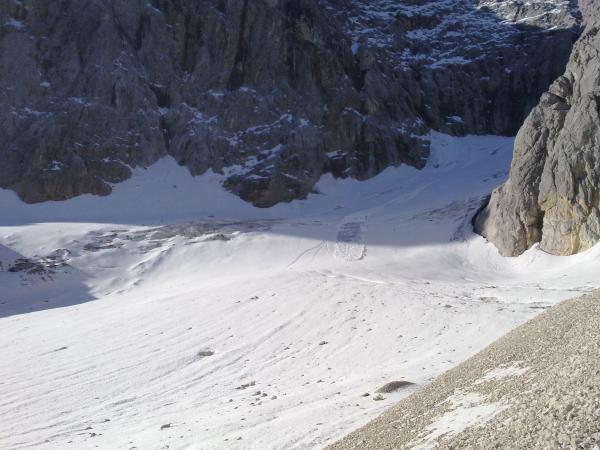 Schönstes Herbstwetter, mild. Ab 2600 und auf Gletscher Schnee. Gute Spur. Schrund ist zu.