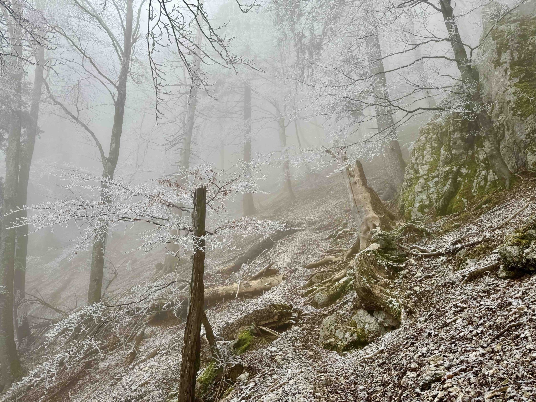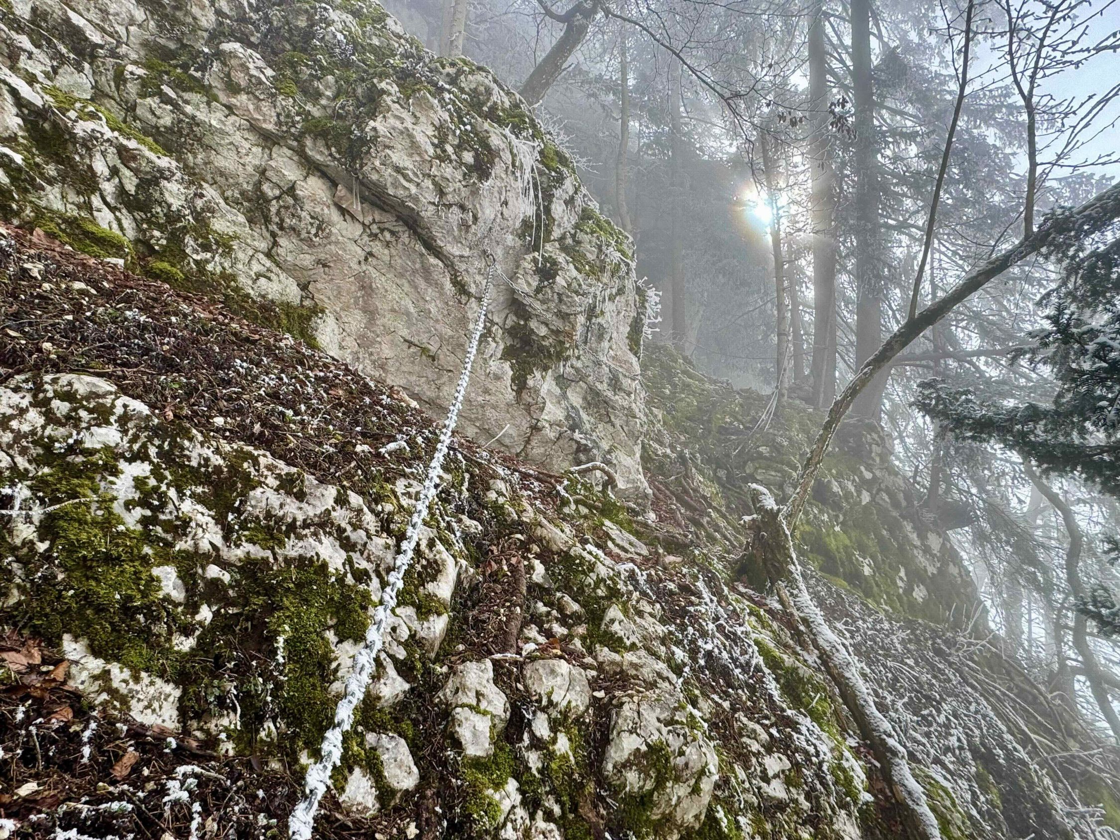 Nebel und Reif. Boden und Fels leicht gefroren und eklig rutschig.