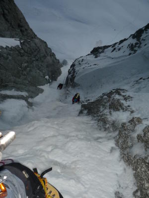Im Fussabstieg ebenfalls gute Schneeverhältnisse. Der Normalweg auf den Tacul weist im obersten Teil zur Zeit eine sehr steile Stelle auf, welche ein ernsthaftes Hindernis für Mont Blanc Aspiranten sein kann!