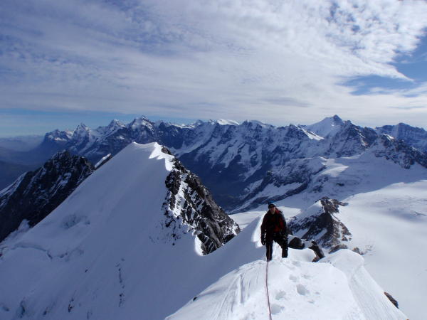 Schnee auf dem flachen Teil des Gletscher hat sich gut gesetzt und war am Morgen auch tragfähig und die Spalten sind gut zu sehen. Am Morgenhorn war dann für das erste Stück bis auf den NW-Grat schon Spuren in schuh- bis knietiefem Schnee angesagt. Im obersten Teil des NW-Grat mussten wir ca. 5 Seillängen mit Schrauben absichern.