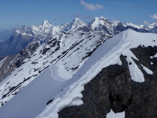 Am ganzen Grat vom Morgehorn bis Blümlisalp trafen wir dann auf gut "schuhtiefen" mehligen Schnee, welcher gespurt werden wollte. Dank der griffigen Unterlage waren die Firnpassagen aber trotz anstrengender Spurarbeit gut zu gehen.