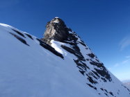 Der mehlige Schnee auf den losen abwärtsgeschichteten Platten machte aber die Kletterstellen zwischen Wyssi Frau und Blümlisalp recht anspruchsvoll. Zwar kann der Nachsteiger von oben immer an Stangen oder Schlingen etc. gesichert werden, aber für den Vorstieger war ein absichern praktisch nicht möglich. Ev. haben wir auch Sicherungen "verpasst" welche unter dem Schnee lagen.