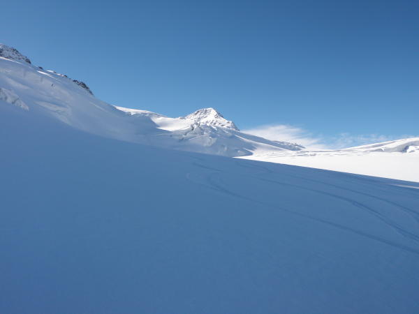 Skitouren im Gebiet überall dort möglich, wo Gletscher sind.Schneeauflage ca. 30cm. Dafür gute Verhältnisse mit Bedingungen wie sonst im März. Lediglich die Spaltensituation erfordert Umsicht und das Gehen am Seil.