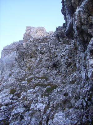 Bin alles seilfrei mit Kletterschuhen und Helm gegangen, was gut geht, da die IV- Stelle am Grat nur kurz und nicht ausgesetzt ist. Der III+ Pfeiler sieht zwar kurz sehr steil aus ist aber fest und mit super Griffen und Tritten.