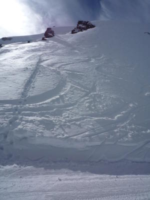 In der Gipfelflanke sowie im Hang direkt über der Bergstation der Skilifte Allalin 2 schöner Pulver, im Mittelteil Windharsch. Über dem Bergschrund stößt man auf ca. 10m aufs Eis durch (ca. 10-15cm Pulver auf Eis), stört bei der Abfahrt bei guter Routenwahl aber nicht.
